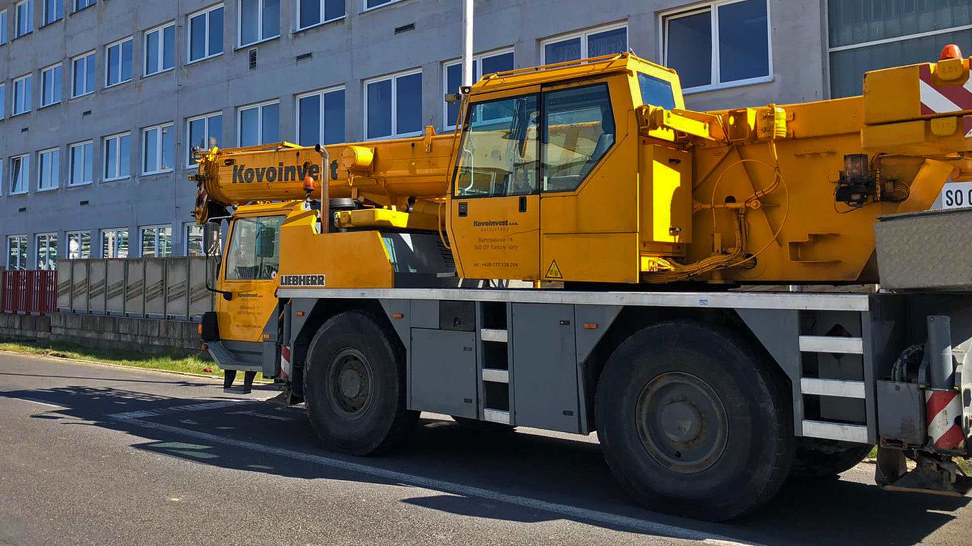 Takto náš jeřáb přesunul mototorový vůz ze železniční tratě do areálu Světa Záchranářů Karlovy Vary.